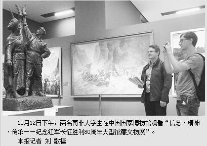 “我不仅看到了长征的艰难,也看到了坚韧不拔的伟大精神。正是秉承这种精神,中国人战胜困难,实现了发展和繁荣。”金秋10月,南非大学生查克力在北京只有一周的交流学习时间,但他还是专门赶到中国国家博物馆观看长征主题展览。