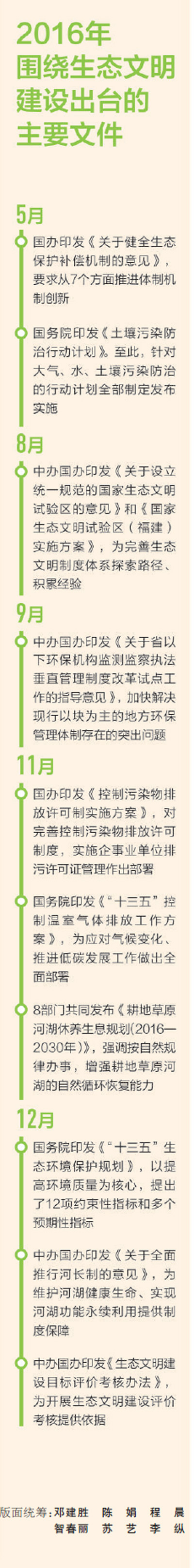 盘点2016年生态环保领域大事,令人振奋。从中央环保督察制度形成到省以下环保机构垂直管理试点,从国家生态文明试验区试点到生态环境损害赔偿制度试点,生态文明制度建设已经按下快进键,改革步伐加快,成果有目共睹。