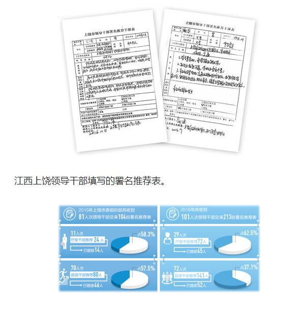 2015年4月,上饶出台《上饶市干部选拔任用署名推荐工作的暂行办法》,建立了干部推荐工作署名推荐和责任追究制度。据统计,2015年,市委组织部共收到81人次领导干部交来的104份署名推荐表,已提拔任用60人;2016年,共收到101人次领导干部交来的213份署名推荐表,已提拔任用97人。