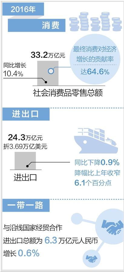 据介绍,2016年,我国实现全年社会消费品零售总额达到33.2万亿元,同比增长10.4%,最终消费对经济增长的贡献率为64.6%。至此,消费连续3年成为我国经济增长的第一驱动力。