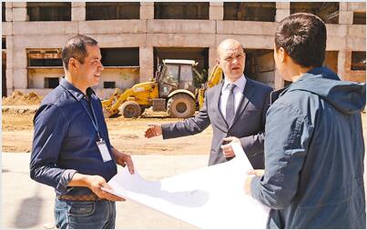 乌克兰法斯托夫市市长涅加茹克(中)在二期厂房建设工地向何生根(左)等厂方人员了解工程进展。