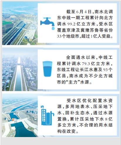北京地下水水位又回升了!4月底监测显示,北京平原区地下水埋深同比回升0.36米,这是自2015年7月以来的持续回升,背后离不开南水北调的功劳。调南方水,解北方渴。截至6月4日,南水北调东中线一期工程累计向北方调水99.2亿立方米,相当于向北输送了690个西湖的水量。调水线成为供水“生命线”,受水区覆盖京津及冀豫苏鲁等省份33个地级市,超过1亿人受益;调水线也成为绿色“生态线”,沿线治污提速,修复生态,绿色发展理念深入人心。南水北调,这一水资源优化配置的重大战略性基础工程,取得实实在在的社会、经济、生态综合效益。