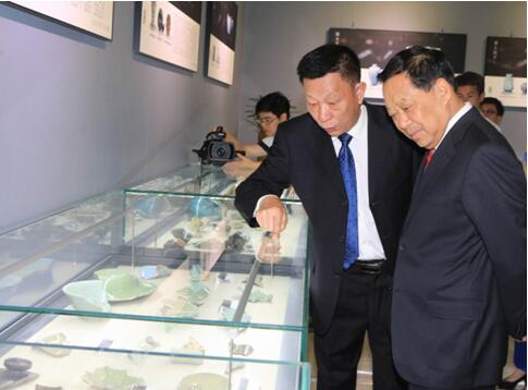 景德镇市政协主席黄康明(左一)陪同全国政协副主席刘晓峰(右一)参观《“国之瑰宝”——中国景德镇陶瓷文化展》首展。
