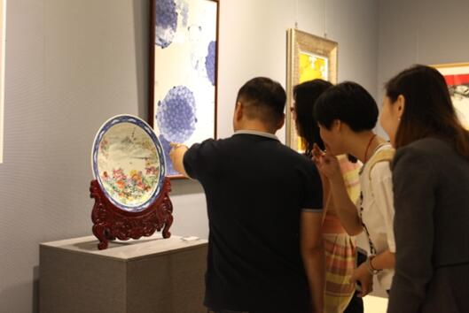展览现场,一款为纪念香港回归20周年特别创作的《同心圆梦》珍藏大圆盘格外引人注目,该作品直径达49cm,由中国工艺美术大师曾瑾和中国陶瓷艺术大师涂翼报联袂创作,采用景德镇两大传统工艺粉彩和青花相结合的方式呈现出盛世中华的全景:气势磅礴的壶口瀑布、绵延的万里长城、雄壮的南京长江大桥,北归的大雁,国花牡丹与香港特别行政区区花紫荆花交相辉映,寓意牡紫连心,各省代表花卉百花齐放,一派欣欣向荣的景象,承载了国人寄予的美好寓意,象征着全国各民族紧密团结,为实现中华民族伟大复兴的中国梦勠力同心!