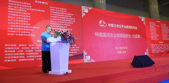 本次发布会由全国农产品加工产业发展联盟、中国乡镇企业协会联合主办,三农云服务专业委员会与北京统领网络云科技有限公司联合承办。农业部原常务副部长刘成果、农业部农村社会事业发展中心副主任李叡、中国卫星应用产业协会常务副会长王平、农业部农产品加工局科技处处长路玉彬、武警总部政治工作部张令军、世界物联网研究院执行院长卞洪登等领导应邀出席了发布会。