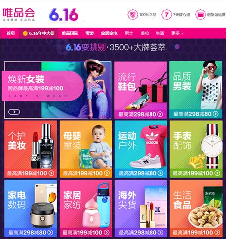 在6.16年中大促中,唯品会3500+大牌覆盖超过10大品类。女性最爱采购的品类商品均以大力度五折优惠,女装、母婴、美妆、配饰、家居家纺、生活食品最高全场满199减100,鞋包、男装、运动、数码家电、海外商品亦有最高满298减80、上不封顶的优惠力度。