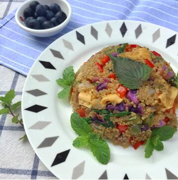 第一准备熟藜麦、大米饭适量,鸡胸肉、洋葱、紫甘蓝、食盐、老抽、蚝油、植物油、姜汁等配料。第二将蔬菜洗净切块,将鸡胸肉下锅翻炒并加入蔬菜和调味品。第三待鸡胸肉翻炒为金黄色,加入藜麦大米饭,进行炒制。第四收汁后即可出锅食用。当然,蔬菜的选择也可以根据自己的喜好进行,爱吃辣的朋友还可以加些辣酱,味道更出众!