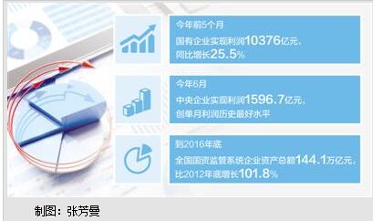完善顶层设计、全面启动试点、“刀刃向内”健全监管……一系列改革措施,激发着国企的活力和竞争力。在国民经济增速放缓的背景下,今年前5个月,国有企业实现利润10376亿元,同比增长25.5%,中央企业今年6月实现利润1596.7亿元,创单月利润历史最好水平。到2016年底,全国国资监管系统企业资产总额144.1万亿元,比2012年底增长101.8%,增加值贡献占全国GDP的1/7。
