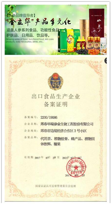 珲春华瑞参业生物工程股份有限公司是省级农业产业化重点龙头企业,公司坐落在长白山东麓——中国图们江区域(珲春)国际合作示范区。公司从人参种植起步,在继承和弘扬中华民族养生文化和“药食同源”文化的过程中,不断挖掘和利用中医药文化的精髓,综合开发利用长白山人参这一特殊资源,研发生产出浑然天成、营养丰富、高品质、高活性的“金立华”品牌人参系列食品、功能性食品、护肤品、日用品、饮品。2010年,公司人参系列功能性食品荣获吉林省名牌产品;2010年上海世博会吉林馆特产礼品;2011年,公司被吉林省农委授予“吉林省农产品加工业百强企业”, 2012年国家卫生部将人参正式列入新资源食品,公司以灵活的经营机制和持续的自主创新,先试先行,迅速占领了人参食品市场,发展成为人参食品精深加工领域最具特色、最具竞争力的企业,同年,公司“金立华”商标被认定为中国驰名商标。2013年,公司被认定为省级企业技术中心和国家高新技术企业,并成为吉林省重点扶持上市企业。2014年,公司被评为国家级“守合同重信用”企业;公司活性人参胶囊、活性林蛙油软胶囊等系列产品被评为国家生态原产地保护产品。2015年9月,公司完成股份制改造;2016年公司成立全国首家以宣传长白山人参为主的华瑞参业长白山人参文化传播学院;公司人参种植基地荣获绿色有机认证基地;2017年,公司人参粉、人参浸膏、人参茶等人参系列产品荣获生态原产地保护产品……
