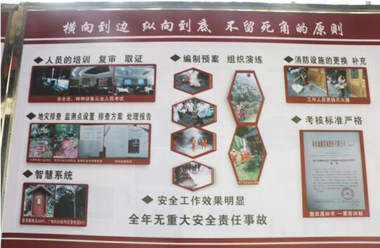 那么,有了完善的组织机构,怎么才能保证“平安景区”创建工作落到实处呢?原来,该公司是拿出了决战决胜和动真碰硬的态度,在创建初期,公司党委召开专题会议进行研究,把“平安景区”创建工作列入到公司党建工作和经营管理工作双重重点工作。经过系统分解,把“平安景区”创建工作分成基础设施、应急事故、游客服务三大板块,包括制度建立、工程建设、秩序引导等20几个分项,分由公司13个部室、六大景区共同参与,并联动地方政府、市场监管、公安、村民群众等涉旅部门和人员,倾力打造真正的“平安景区”。