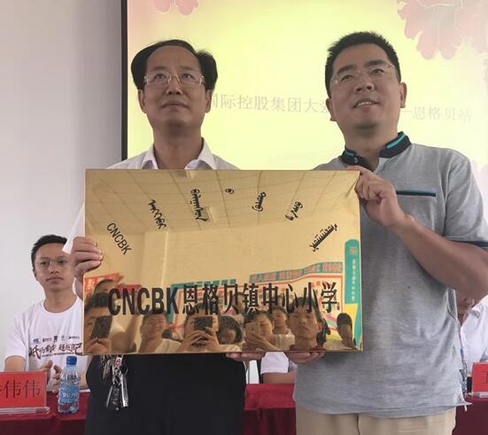 由本届赛事总冠名CNCBK国际控股集团和赛事发起人们携手100位沙漠勇士,共同将大爱带到恩格贝镇中心小学。他们不仅有勇于挑战未知的强大勇气,更有慈善包容的大爱胸怀,慈善活动现场还邀请到了恩格贝镇教育局领导、恩格贝政府领导、恩格贝镇中心小学校长赵永刚,和当地电台媒体共同见证这次赛事带来的大爱传播。