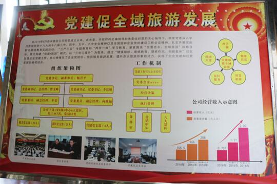 通过建立营销中心党支部,在全国设有8个营销中心和欧洲营销中心,统领赤水旅游市场营销拓展,开启了赤水旅游全域化、国际化、多元化合作的新模式。党委指导支部,大力实施专线营销战略,按照“季季有主题、月月有活动”的要求,开展牵手重走长征路、万人广场舞、万人同学会、乐跑赤水、冬季旅游促销活动等等具有特色性、亲民性、季节性的主题活动。背靠央视、一线卫视、腾讯等主流媒体,成功制作播出如:腾讯视频“八百红军快闪”再现“四渡赤水”,央视CCTV发现之旅“美中之美、丹青赤水”等几十类栏目。拍摄了微电影“爱上赤水”三部曲、“云上赤水”MV等文艺作品,丰富赤水旅游层次感和饱满度,赤水旅游影响力大幅提升。与途牛、携程、淘宝、驴妈妈、美团、贵州大数据等旅游电商建立供销关系,实现“云上赤水”的目标。