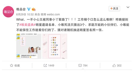 9月3日,30多位明星将闪亮登场“唯•美盛典”为品牌代言。到底谁会来?唯品会提前预热,采取emoji猜明星的方式率先发起盛典互动,最终被机智网友一一攻破。