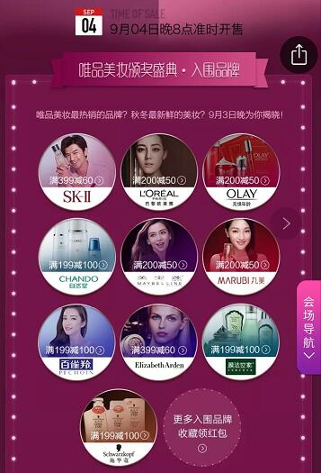 秋季美妆节不仅以明星汇聚的“唯•美盛典”打前站,更携手众多美妆品牌上线1000+新品,更有超值钜惠。谁是唯品会最热销的品牌?秋冬最新鲜的美妆有哪些?9月3日晚,盛典将颁奖揭晓。目前入围的品牌包括SK-II、欧莱雅、OLAY、自然堂、美宝莲、伊丽莎白雅顿等18个品牌,用户可以收藏领红包。