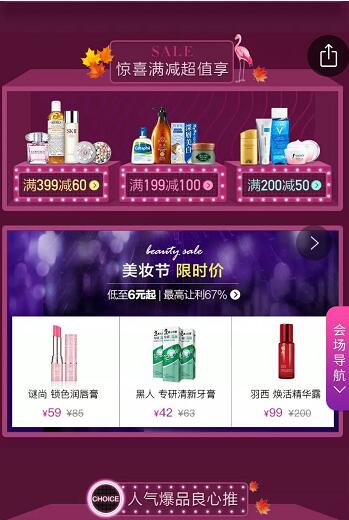 2. 满减互动:美妆专场商品,购物满额即享相应立减优惠,满额立减力度包括:满199减100;满200减50;满399减60;相同满减力度可跨品牌专场累计,上不封顶。