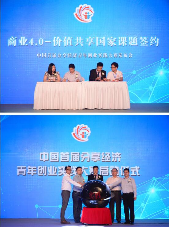 在发布会的最后,富熊(集团)网络科技有限公司总裁熊圣友先生、中国自动化学会智慧城市工作委员会秘书长熊垓智教授、中科院姚建铨院士助理徐箖女士共同签署了“商业4.0”—“价值共享”国家课题战略合作协议。课题签约之后,教育部全国高等院校计算机基础教育研究会秘书长刘贵龙教授、中国自动化学会智慧城市工作委员会秘书长熊垓智教授、《中国产经新闻》报社党委副书记史晨生先生、宁波富熊(集团)网络科技有限公司总裁熊圣友先生、宁波富熊(集团)网络科技有限公司执行总裁李军先生共同启动了中国首届分享经济青年创业实践大赛。