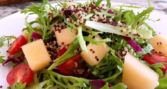 材料:藜麦、紫甘蓝、圣女果、哈密瓜、橄榄油、盐、糖、苹果醋