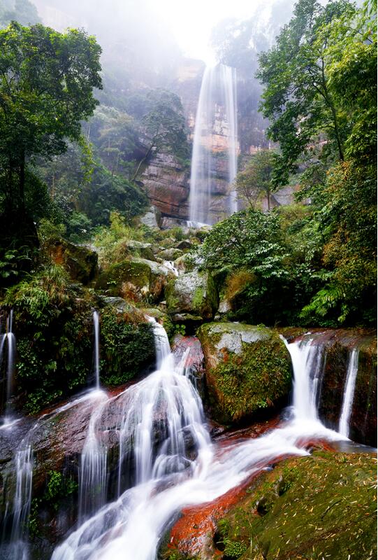 燕子飞瀑,瀑高87.3米,因为半山石壁常有成群结队的燕子从瀑布中飞进飞出,山民就叫它燕子飞瀑。流水伴随着岁月的刀子,无情地把一条条峡谷任意切割,形成一排排垂直的断崖绝壁,加上亘古未开的原始森林,涵养了丰足的水源,于是造就了流水奋不顾身、粉身碎骨的瀑布景观。