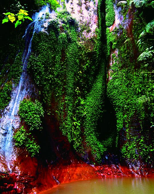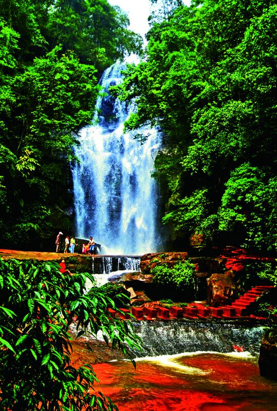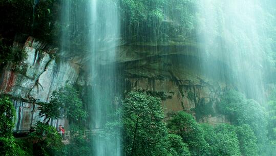 岩穴下面是陡峭的深渊,岩穴上面是狂泻的瀑布,红光四射的岩穴就成了一座童话般的石穴水帘红楼!飞瀑像用千万根透明纱编织成的垂帘,把红楼轻轻遮掩,便赋予了它以琼瑶式的浪漫:一帘幽梦。