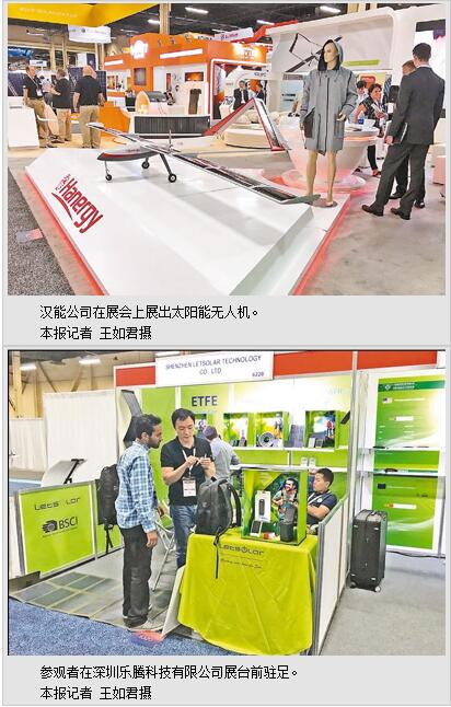 英利、晶科能源、晶澳、阳光电源和隆基乐叶光伏、中国建材集团、汉能等中国太阳能企业都展出了世界一流的产品。隆基乐叶光伏总裁李文学对本报记者说,他们参展的产品有单晶硅电池与组件、分布式光伏电站设备及配件等,双面双玻太阳能板是主打展品,这种产品性能好、成本低、效益高,在太阳能市场有较强的竞争力。比亚迪海外太阳能销售部总经理赵彤在接受本报记者采访时表示,他们的展品包括双面双玻组件在内的4款新型太阳能组件产品等。据了解,比亚迪太阳能组件在美国新能源市场累计出货近1吉瓦,并已占据调频储能市场约50%的份额。展会期间,比亚迪公司还宣布,获得了美国千万美元太阳能组件订单。