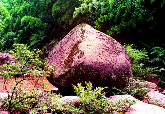 山间翠竹繁茂,红色石径曲折延展。丹霞奇石屹立山巅,石桥自然天成,切角哑竹岛千鹤壳舞,大同古镇古色古香。
