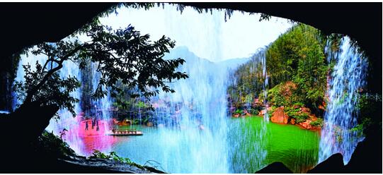 水帘洞瀑布:瀑布宽37、高31米,株帘悬挂,白纱绢绢,声若雷鸣,气势万钧。“水帘洞”三个朱红色大字雕刻崖壁,更显瀑布壮观神奇。