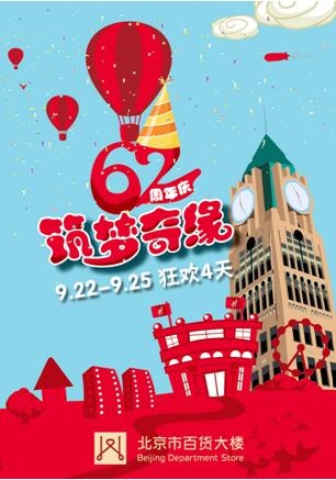 “苟日新,日日新,又日新”,不断地自省与革新,这一精神自古有之,且一直根植于我们的传统文化之中。作为已经62岁的百货大楼,也一直用自己的实际行动在贯彻着这一句《大学》。比如我们前文提到的外立面重装、引进体验式消费、品牌升级等诸多动作。还有更直观的,那就是百货大楼62周年庆的宣传海报。上面画着王府井大街标志性的钟楼,以红色为主色调突出喜庆氛围,饱和度较低的雾蓝色为背景,画面风格与色调都不同于以往传统的百货海报,颇贴近如今年轻一代的审美。内容则更为简要明了,“62周年庆,筑梦奇缘,9.22-9.25,狂欢四天”。寥寥数字,直白却因信息的简化更富有冲击力。