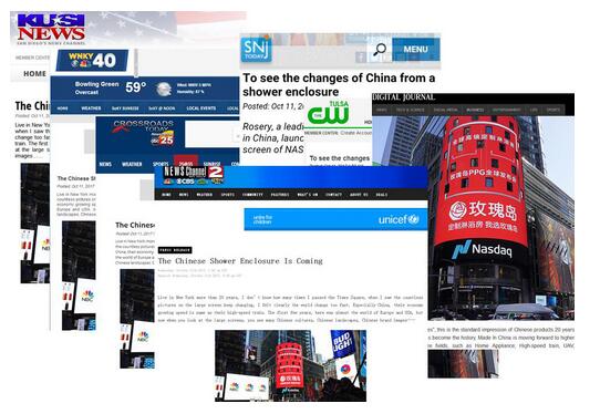 2017.10.10,玫瑰岛淋浴房在美国纳斯达克全球首发新品,美国硅谷财经媒体惊呼:中国淋浴房来了!消息爆出后,众多美媒纷纷转载,并引发热议。