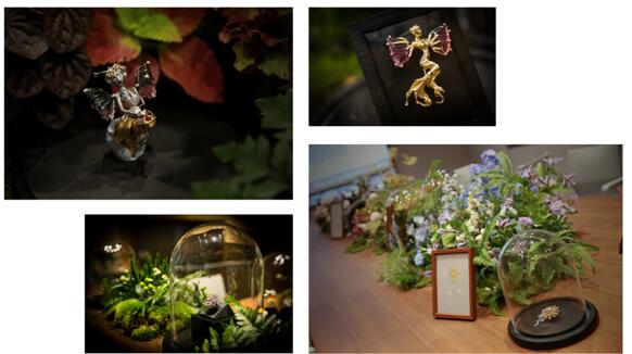 在本次艺术珠宝展上,Kelly Xie特别推出了匠心之作的“珐琅花卉系列”。以空窗珐琅工艺为特色,以中国优美的文人诗句为灵感,创作出极富中国韵味的“水莲”、“红梅”、“霏桃”三款胸针。而在“精灵系列”中,Kelly Xie携手国际顶级蜡雕大师,以精心收藏的碧玺翅膀为主石,精心打造了栩栩如生的精灵女王及小精灵胸针。所有胸针都以360度的立体结构美学姿态,完美呈现出设计师的初衷,让珠宝设计不再囿于平面,莫不带给观展者极大的视觉享受。