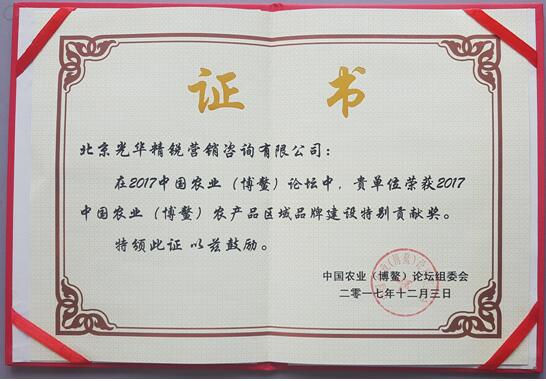 北京光华精锐营销咨询有限公司荣获农产品区域公用品牌建设特别贡献奖。北京光华精锐汇聚国内数十多位资深营销专家和设计创意专家。长期专注于农业区域品牌与食品农产品企业品牌的实战咨询、推广服务及特色地标农产品品牌建设与保护工作。结合多年来亲自运作和指导的近数十个品牌农业成功案例和实战经验,为全国多个地市区县的农业部门、涉农协会及知名企业累计培训数百场次。2010年推出国内首部品牌农业专著《狂吃十万亿》,并陆续出版《狂圈十亿亩》及《品牌农业大革命》等系列现代农业书籍,成为中国农业品牌化建设重要推动力量。