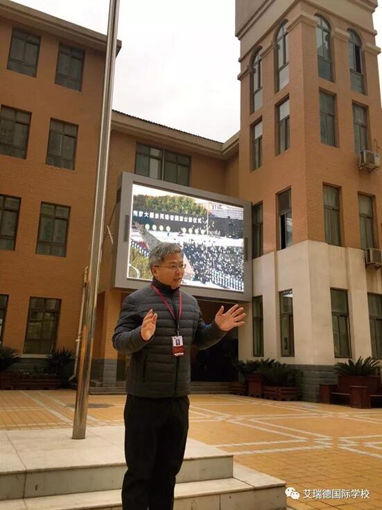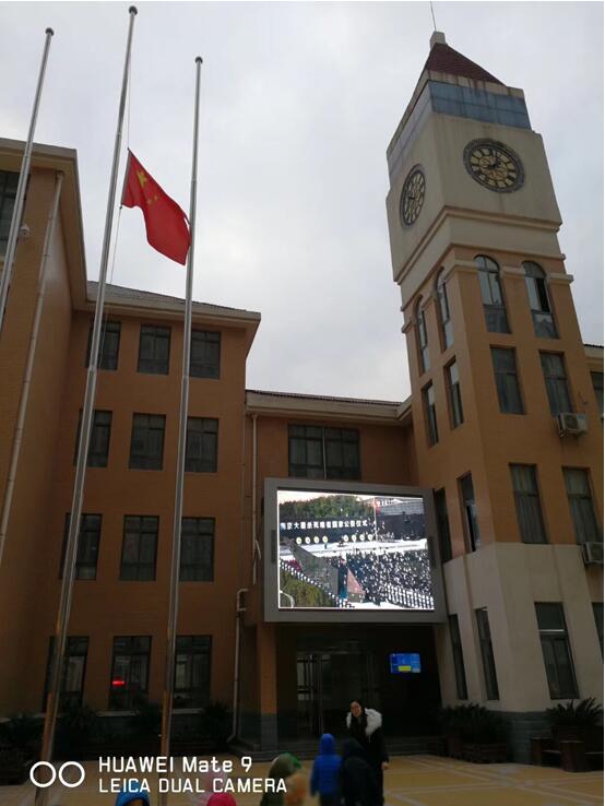 在12月11日,周一的升旗仪式上,李建华校长在升旗仪式“校长讲故事”环节,庄重的讲述了第14个故事——《我们站立的地方叫中国》,并倡议全体师生在12月13日收看国家公祭仪式转播、不参与娱乐活动、不穿鲜艳色彩服装、参与网上公祭等,并提议在12月13日当天,学校降半旗以示纪念国家公祭日。