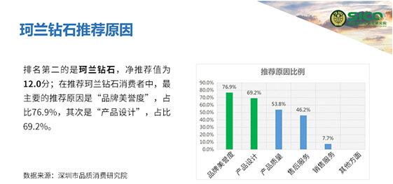 值得一提的是,在总共六项的评分标准中,珂兰的品牌美誉度推荐率(76.9%)、产品设计推荐率(69.2%)、产品质量推荐率(53.8%)、售后服务推荐率(46.2%)四项分值均居行业第一。该调查结果来自近期在深圳珠宝品牌门店消费过的真实消费者抽样,排名越高,意味着消费者更愿意主动推荐该品牌。