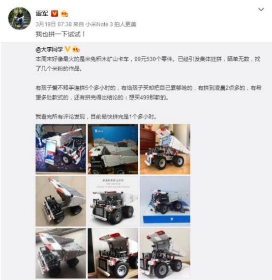 其实,雷军对米兔指尖积木的推崇不只这一次,在2018年1月就连续两次在个人微博中点名表扬米兔指尖积木,在2018年3月,雷军还亲自为米兔矿山车的新品发售在微博上助阵,表示会买一个自己搭建。