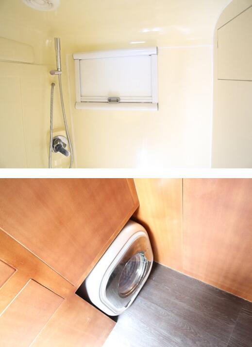房车从车门到车头的设施配置为储物柜组、小型洗衣机、独立卫浴间、厨房(带冰箱)、卡座沙+气动升降桌(可拼床)、额头大床。