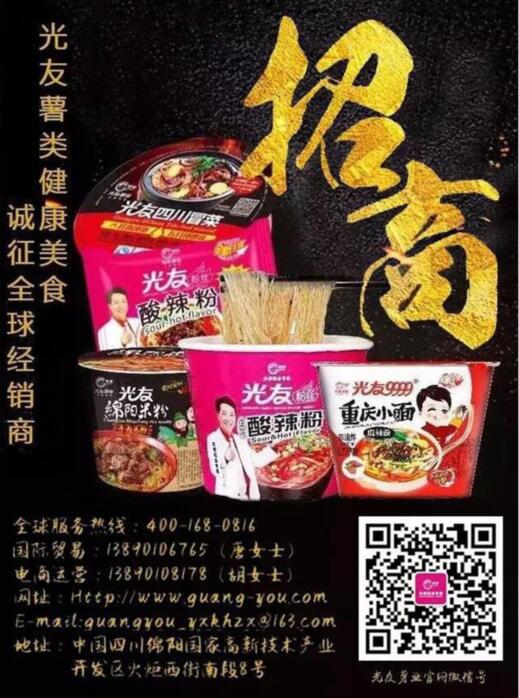 对于很多绵阳人来说,崭新的一天都是从一碗热气腾腾的米粉开始。但除了米粉,绵阳还有一种让人百吃不厌、同样朗朗上口的美食——光友粉丝。光友薯业成立26年来,专注以红薯、马铃薯等薯类为主要原料的光友方便粉丝、光友非油炸薯类方便面、光友米粉、光友早餐、光友方便火锅、光友煮粉、光友调料、光友紫薯保健食品等8大系列、100余个单品。以其美味、健康等特点,畅销美国、日本等海内外市场,受到消费者追捧。