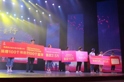 为了筹集更多的爱心资金帮助留守儿童,海南省青少年希望基金会和海南省留守儿童关爱志愿者协会共同设立“海南希望工程留守儿童关爱基金”(以下简称童爱基金)。晚会现场,共青团海南省委副书记林洪冰、海南省青少年希望基金会理事长兼秘书长羊光然、海南省留守儿童关爱志愿者协会会长俞保华共同为该基金揭牌。现场向爱心基金捐赠的单位(人士)有:海南第一投资控股集团有限公司捐款100万元,海南意天缘景观工程有限公司捐款50万元,童爱会会长、海南安徽商会执行会长俞保华向童爱会捐赠一辆商务用车,海南米井通信技术有限公司捐款25万元,海南天涯心理学应用研究所、海口汇城企业管理咨询有限公司、海南跃锟动能教育培训有限公司、海南天悦拍卖有限公司分别捐款10万元,海南梦演艺剧院管理有限公司、海南徽园装饰工程有限公司、文昌吉方实业有限公司、爱心人士丁婧力女士分别捐款5万元,三亚盘古传人商贸有限公司捐款2.5万元,海南省亳州商会捐款1万元。