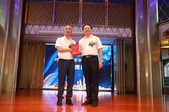 内蒙古财经大学党委书记高金祥(右)为内蒙古财经大学上海校友会第一届理事会会长方铭贤颁发聘书