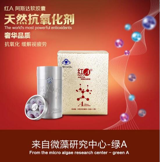 在众多健康产品中,虾青素是经全球医学界认可自然界最强的抗氧化剂,其抗氧化强度是维生素E的550倍,同时具有抗衰老、抗肿瘤、抗炎症和抗疲劳等功效,而雨生红球藻中虾青素含量为1.5%~5%,被看作是天然虾青素的"浓缩品",被国家卫计委特批为新资源食品。绿A凭借微藻领域的强劲科研实力与产业化经验,在2013年突破红球藻虾青素萃取提取技术,获得6项自主发明知识产权专利,打破了美、日两国的技术垄断。后续推出"红A阿斯达"软胶囊健康产品,为我国红球藻的规模化生产鉴定坚实的基础,也为未来老龄社会贡献更多高端有效的解决方案。