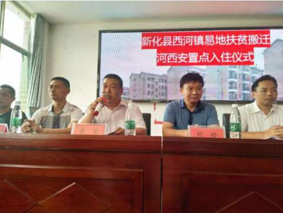 7月13日,新化县西河镇沙江村委会二楼会议大厅人头攒动,热闹非凡,该镇易地扶贫搬迁河西安置点贫困户集中入住仪式在此举行。县委常委、县委办主任刘迟辉、县易地扶贫搬迁联席办主任刘晗、省建工集团公司副总周超及西河镇党委书记谢建斌、镇长袁宏出席仪式。县扶贫办、县扶贫投等相关领导参加。仪式由镇长袁宏主持。
