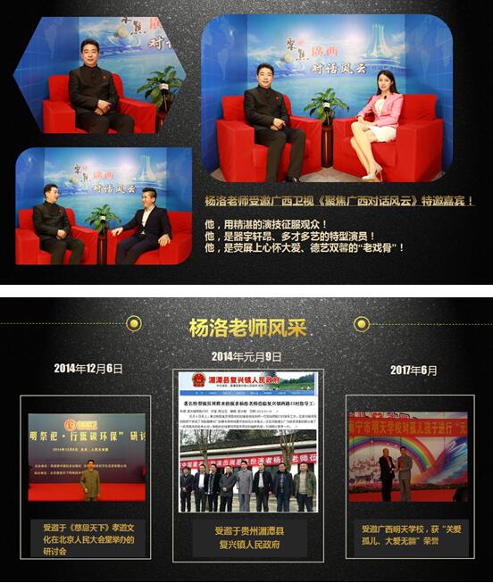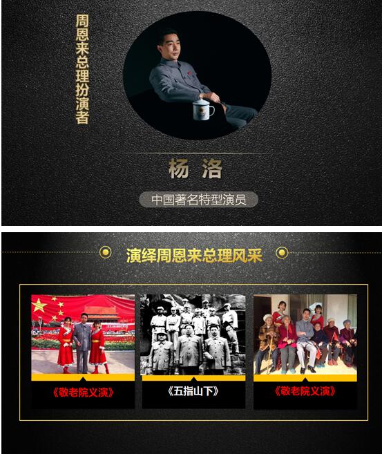 因饰演周总理而被全国观众熟知的杨洛,为人低调、和善,对环保事业和慈善事业特别上心,是一个具有大爱胸怀的公益大使,多年来一直在为贫困地区义演,曾获得过“关爱孤儿,大爱无疆”等慈善荣誉称谓,是一位品德、修为、演技同时在线的国家一级特型演员。