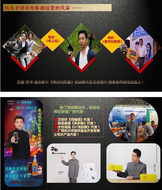 在励志电影《绝对扫把星》中担任出品人的杨洛老师,在银幕上是亲切、智慧在形象!在幕后,则是多才多艺的电影出品人,和一般的特型演员相比,杨洛老师转战电影、电视剧幕后制作的选择是成功的,因为他已经用个人实力证明了自己的能力,他是那个可以演活周恩来,也可以在幕后成为出品方的影视界达人,幕前、幕后,都有属于他的个人施展天地。