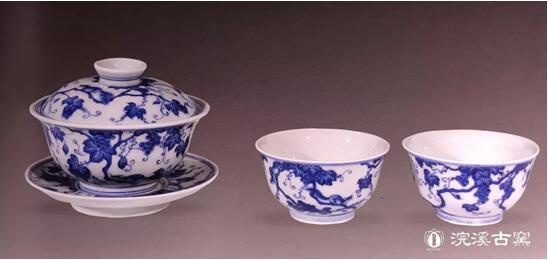 浣溪人经过几个月实践,多次失败之后,终于摸索出一条可以成功烧成青花的方法。本次嘉德拍卖成功的松鼠葡萄盖碗套组,就是龙窑柴烧的精品。