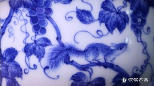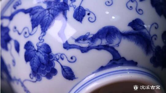 在葡萄纹的绘制上,浣溪以康熙青花松鼠葡萄纹碗为蓝本,在继承精髓的同时,提升了绘制精度,枝叶纹理更加清晰细腻,脉络清朗舒展,藤蔓缠绕为双向,极有规律可循。纹饰叶片双勾填实并勾筋脉,叶片边际圆润,分水的功力在叶捎和葡萄的边际尤为明显和清晰,层次分明细腻;葡萄的勾线、点饰、留白也颇有斟酌,力求松活而不松散。