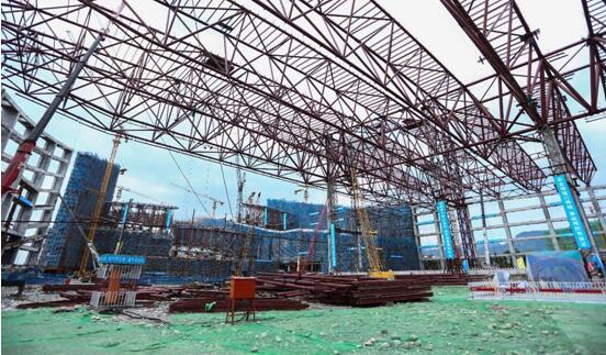 娱雪乐园屋面钢结构长428m、跨度174m渐变至94m,总用钢量1.2万吨。其中低区屋盖为变截面倒三角钢管桁架结构,最大跨度90m,桁架最大矢高14m,地面拼装完成后采用2台650T履带吊高空吊装;中区屋盖为空间倒梯形钢管桁架结构,桁架最大高度14.5m、最大宽度8.4m、最大跨度166m,造型由西至东呈弧度上升的自由曲面,最大高差27m,采用“楼面拼装、整体累积提升”的方式配合1台450T履带吊吊装;高区屋盖为空间倒三角形钢管桁架结构,桁架最大高度13.3m、最大宽度9.3m、最大跨度124m,最大高差27m,最大悬挑13m, 采用“累积滑移+局部提升”的方法,利用1台150T和1台650T履带吊配合塔吊进行安装。