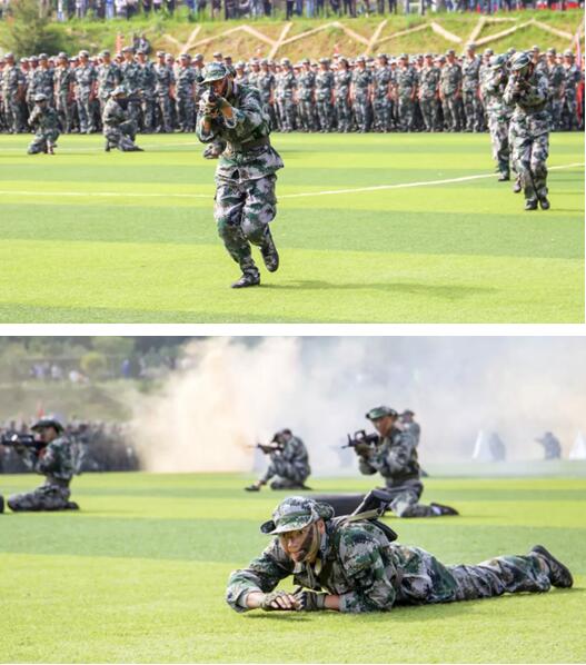 你瞧,一群小伙伴涌入足球场跳起了炫酷的街舞,刹那间,一群“劫匪”悄然而至,从四面八方“围剿”了街舞团的伙伴们,情况危急,由30名勇士组成的“敢死队”前来营救,他们手持钢枪、冲锋陷阵、前赴后继,一时间,场上烽烟四起,远距离“射击”、近身格斗,一击必“杀”,最终将“人质”成功解救。原来,这是一场特战技能表演。