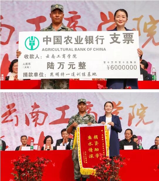基金6万元,李娅副校长向特一连赠送锦旗。