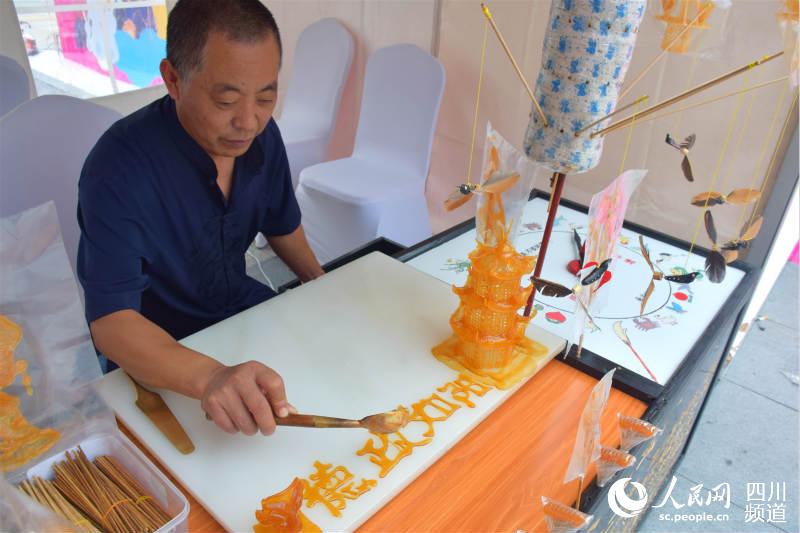 在舞台的另一侧,川剧、绵竹年画等传统文化展示吸引了众多市民围观。在剪纸、糖画等传统民俗、技艺体验区,市民们对传统民俗技艺表现出了浓厚兴趣,纷纷动手体验传统民俗、技艺的魅力。