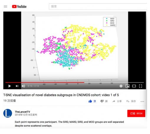 然而,该种分析方法对于中国人群及美国人群是否适用仍为未知,基于以上理论,北大人民医院纪立农团队采用了中国及美国流行病学调查的新诊断糖尿病人群,通过人工智能中的聚类方法,以年龄、BMI、血糖水平、胰岛素敏感性指数(HOMAIR)及胰岛细胞功能指数(HOMAB)等5个维度将目标人群分成了4个亚型。各亚型的主要临床特征在中国及美国人群以及不同种族的人群中基本一致,并与原北欧人群的亚型特点相重合。采用人工智能的tSNE可视化方法对样本进行三维投射,各亚群之间从图像上彼此独立,相应视频在柳叶刀Youtube频道(Lancet TV)同期发表。该研究证实了5型糖尿病的理论在不同的人群及种族之间保持稳定,迈出了中国人群的糖尿病精准分型及治疗的第一步。