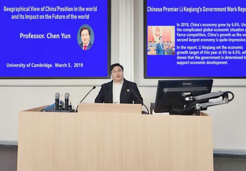 欧洲网伦敦3月6日电 (李恒)伦敦时间5日下午,跨领域经济学家、2011年度阿玛蒂亚•森经济学奖得主、北大博雅特聘教授陈云在剑桥大学访学研修之际,发表题为“中国在世界上的地理位置及其对世界未来的影响”的主题演讲。剑桥大学耶稣学院詹姆士•莎士比亚(James Shakespeare)主任牧师,剑桥大学“一带一路”国际研究中心联合发起人马克•威廉姆(Mark Williams)教授等200多名剑桥大学师生与会聆听。