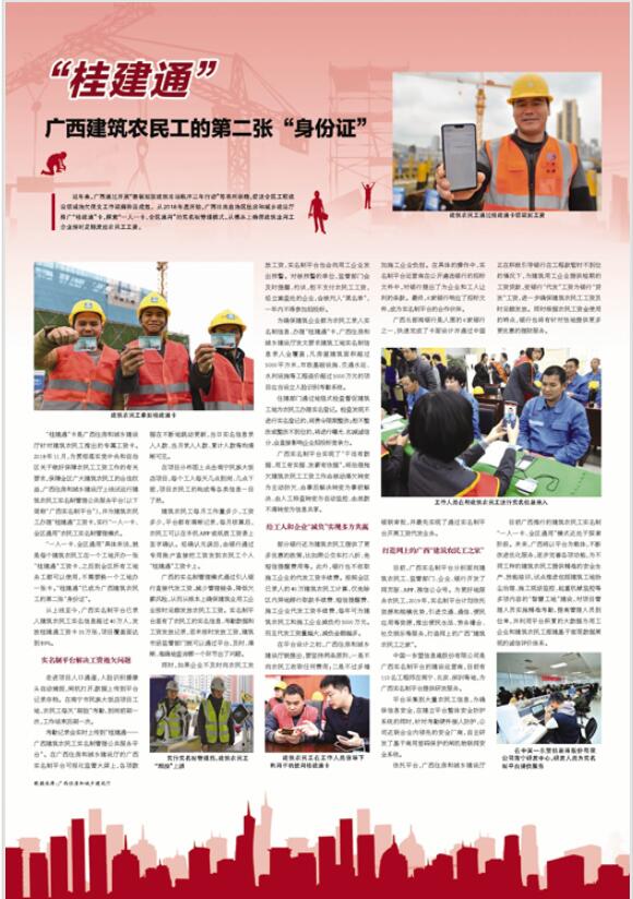 近年来,广西通过开展“整顿规范建筑市场秩序三年行动”等系列举措,促进全区工程建设领域治欠保支工作取得阶段成效。从2018年底开始,广西壮族自治区住房和城乡建设厅推广“桂建通”卡,探索“一人一卡、全区通用”的实名制管理模式,从根本上确保建筑业用工企业按时足额发放农民工工资。